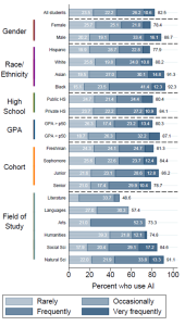 AI adoption is far from uniform. Natural Sciences majors (which includes computer science and math) lead with 91.1% usage, while Literature (48.6%) and Languages (57.4%) show substantially lower rates. This variation likely reflects how well AI capabilities align with field-specific academic tasks.