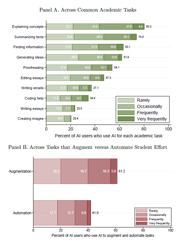 Contrary to fears about widespread academic dishonesty, students use generative AI more for augmentation (61.2%) than automation (41.9%), as shown in Figure 1.
